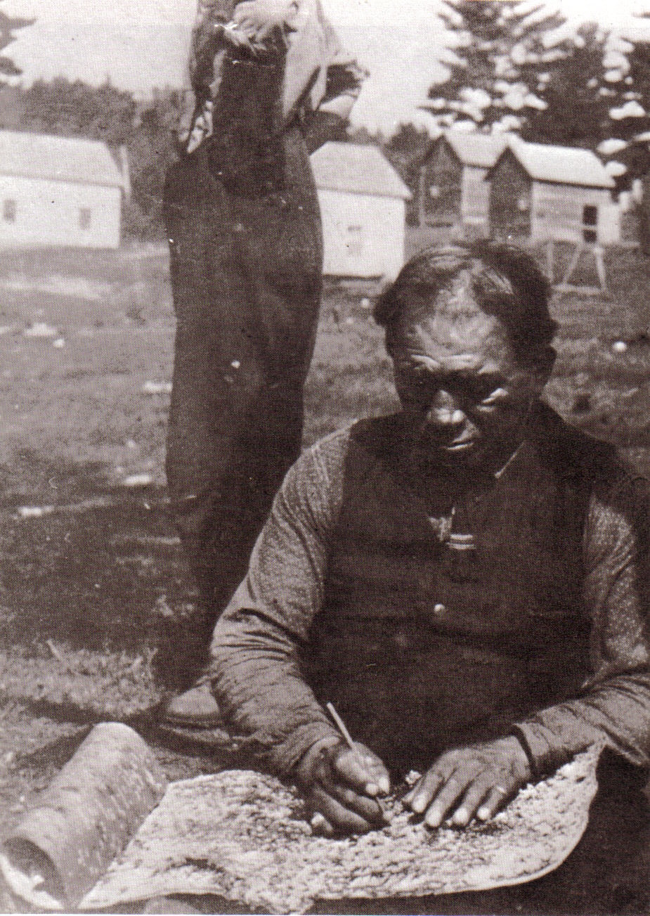 Writing on bark....this writer is posed to show the manner of sitting while writing on bark. - Courtesy of Minnesota Historical Society